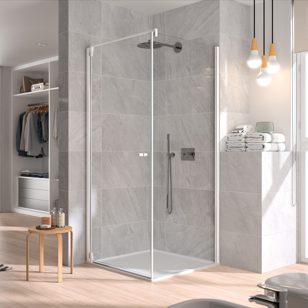 Glas 6 mm ESG transparent, Standardhöhe bis 2000 mm, keine Sonderhöhen möglich, links und rechts verwendbar, Pendeltüren öffnen nach innen und außen, optional mit 4 mm hoher Schwallschiene, PALM.free, PALM.fix, PALM.lift, PALM.invisible, optional PALM.nano