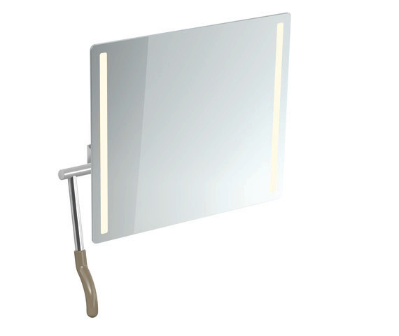 rechteckiger beleuchteter Verbundspiegel mit geschliffenen Kanten, eingearbeiteter Splitterschutz und integrierte LED seitlich, Einstellen der Neigung im Sitzen von 0-28°, zur Wandmontage, Direktanschluss 200-240 V, mit 2 LED-Leuchtprofilen aus Aluminium, rückseitig befestigt, neutralweiß, ca. 4000 Kelvin, Gesamtleistung ca. 9,6 Watt, LED und Vorschaltgerät geschützt, Schutzklasse II, Schutzgrad IP 44, verdeckte Montage mit beiliegendem Befestigungsmaterial, Griffstange aus verchromtem Aluminium, Achse aus pulverbeschichtetem mattem Aluminium, mit ergonomisch geformtem Griff aus Polyamid