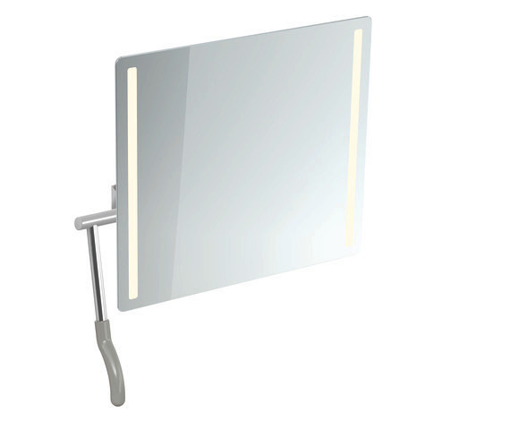 rechteckiger beleuchteter Verbundspiegel mit geschliffenen Kanten, eingearbeiteter Splitterschutz und integrierte LED seitlich, Einstellen der Neigung im Sitzen von 0-28°, zur Wandmontage, Direktanschluss 200-240 V, mit 2 LED-Leuchtprofilen aus Aluminium, rückseitig befestigt, neutralweiß, ca. 4000 Kelvin, Gesamtleistung ca. 9,6 Watt, LED und Vorschaltgerät geschützt, Schutzklasse II, Schutzgrad IP 44, verdeckte Montage mit beiliegendem Befestigungsmaterial, Griffstange aus verchromtem Aluminium, Achse aus pulverbeschichtetem mattem Aluminium, mit ergonomisch geformtem Griff aus Polyamid
