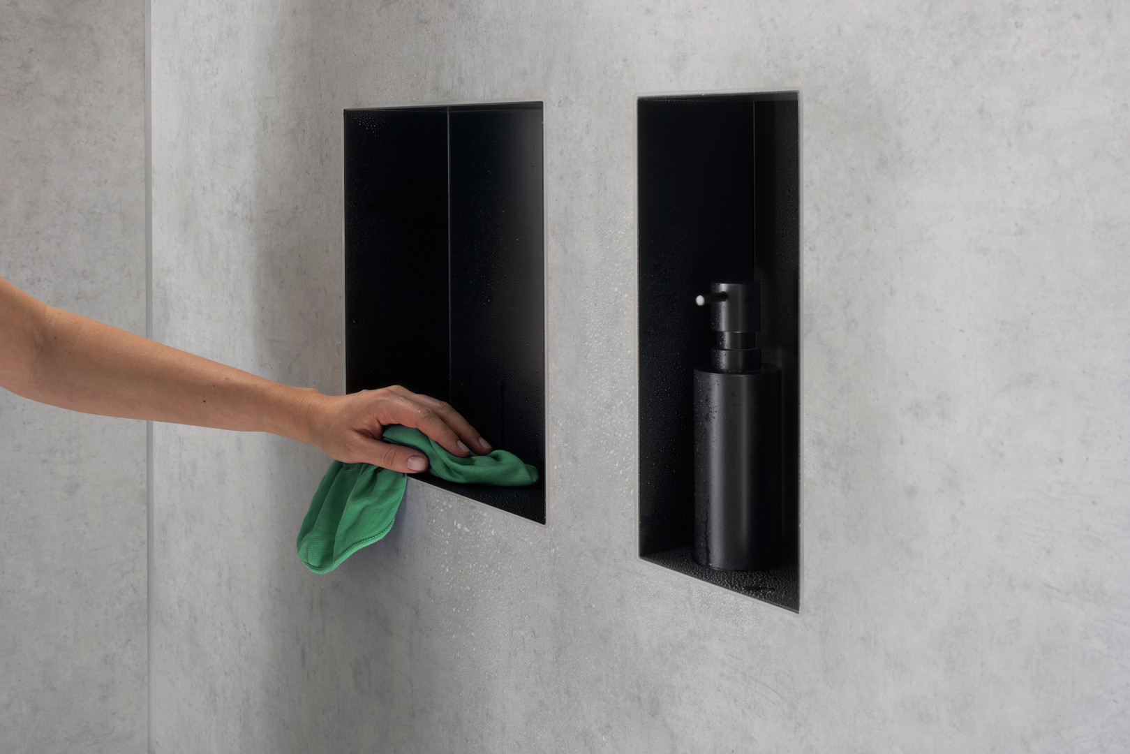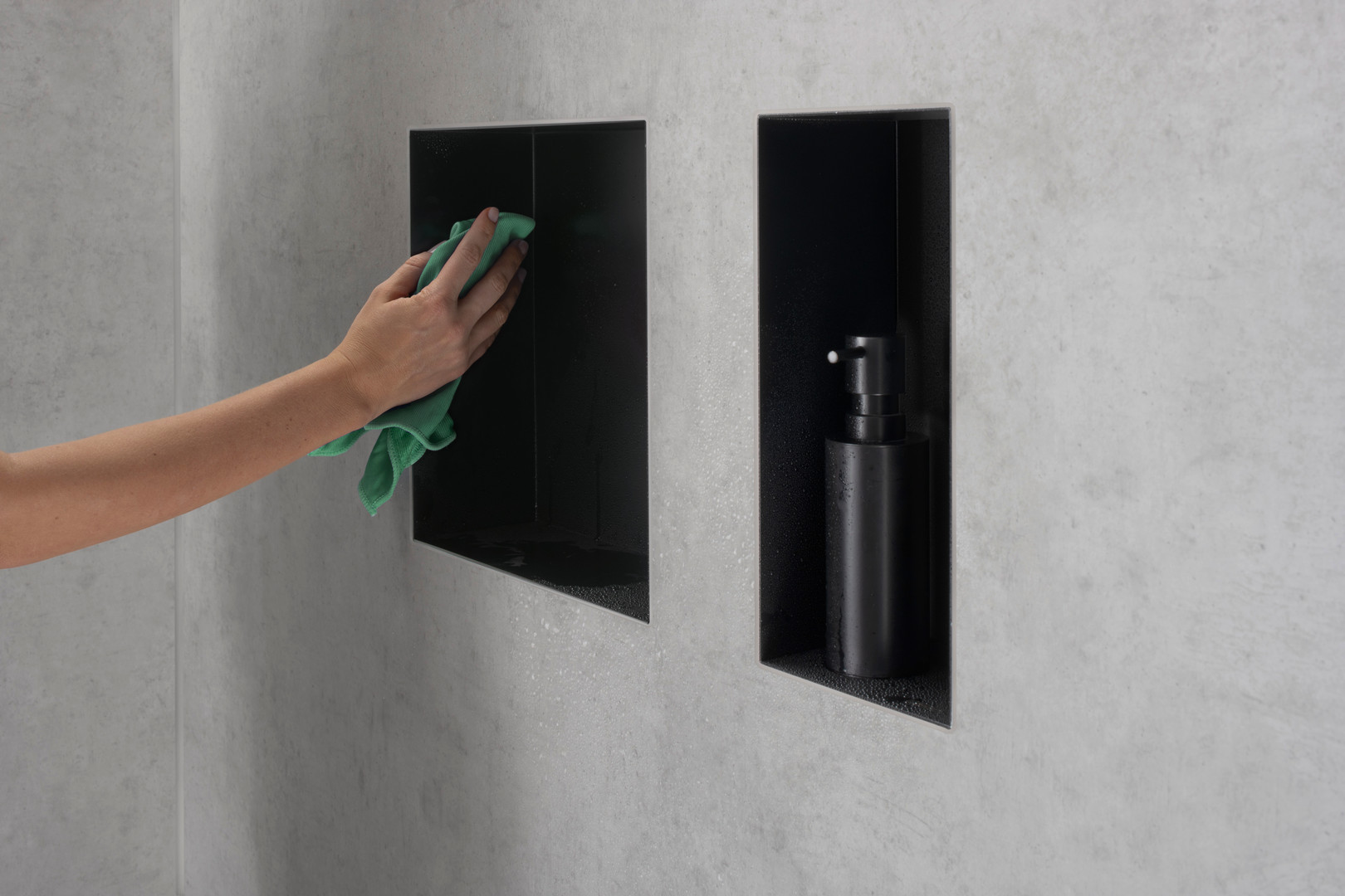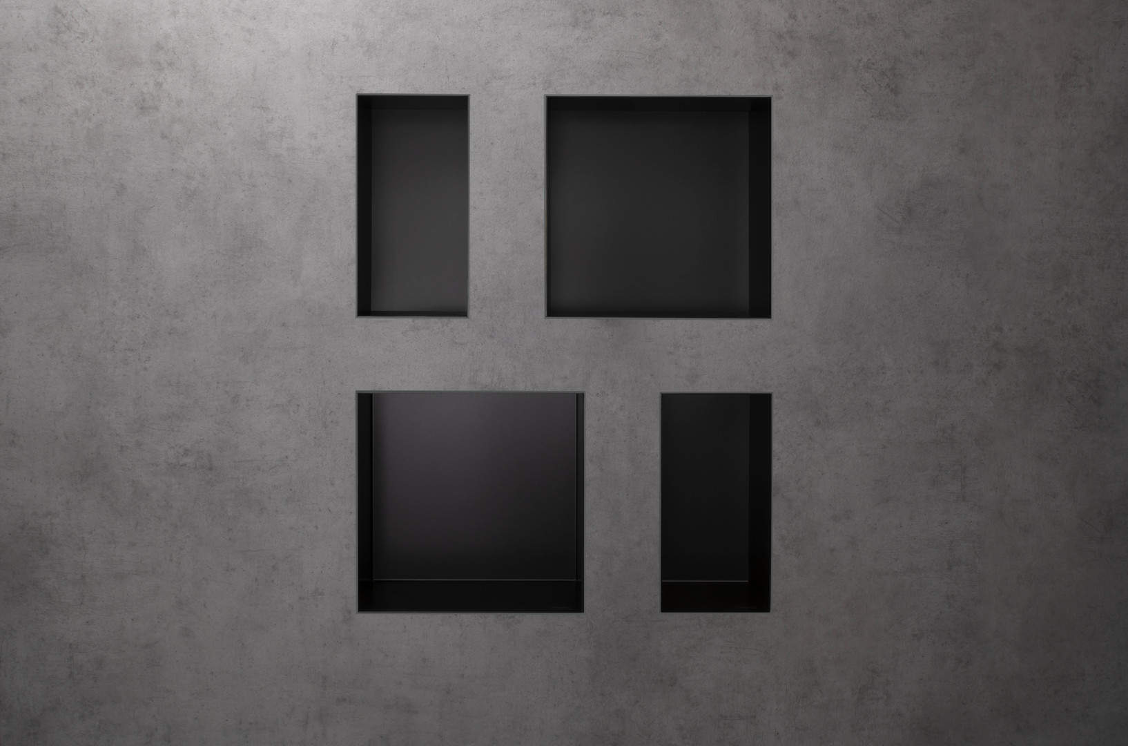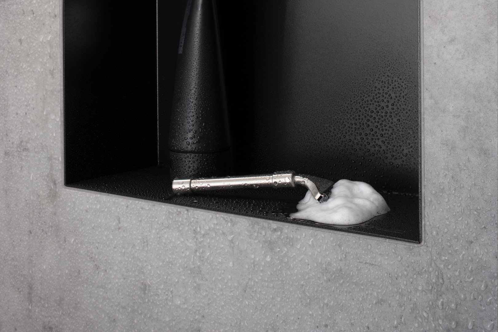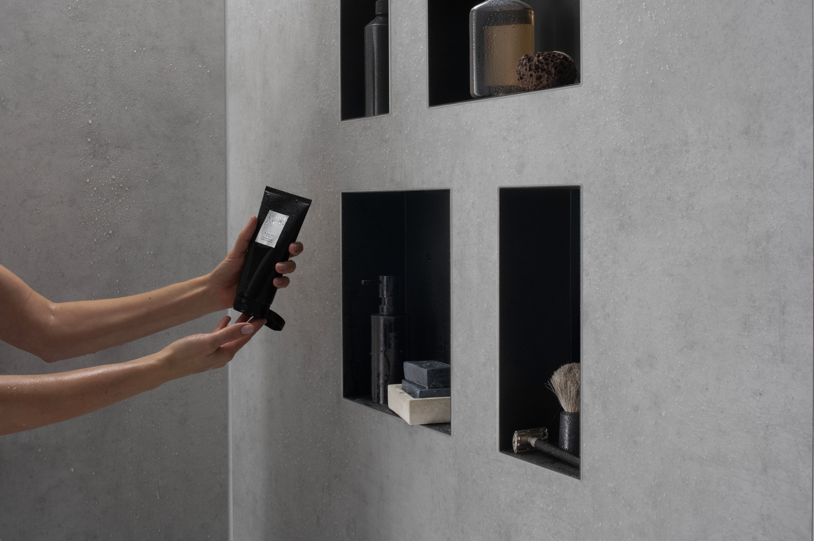 bestehend aus Wandnische rahmenlos, Dichtungsset, Einbautiefe 100 mm, Anwendungsbereich Neubau, Sanierung, variable Installationstiefe, bündig mit der Fliese oder als Designelement bis zu 55 mm herausstehend installierbar, rahmenloses Design, speziell für die Anwendung im Nassbereich, Anpassung an Fliesenstärke möglich, Wandtyp: Trockenbau, Nassbau, Material Sichtungsset: Polystyrol (PS), Werkstoffgüte Wandnische Edelstahl V2A (1.4301), Vermeidung von Wasserschäden durch wasserdichtes Grundset und vormontiertes Dicht-Vlies