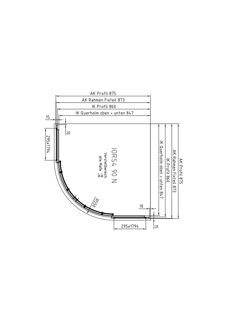 Palme Runddusche 4-tlg. Valletta EOS 88 x 185 cm, Radius 55cm, KGL Tropfen transparent, Alusilber W280823