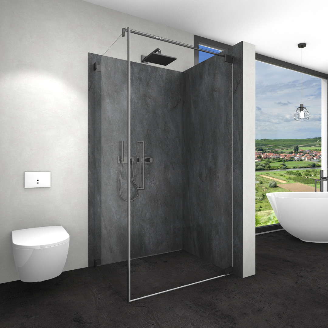 Glas 8 mm ESG, Standardhöhe 200 cm, Tür öffnet nach Innen und Außen, bodeneben, ohne Schwallschiene, PALM.fix, PALM.lift, PALM.free, PALM.isi-clean, optional PALM.nano, PALM.care, punktuelle Wandbefestigung mittels Beschlägen