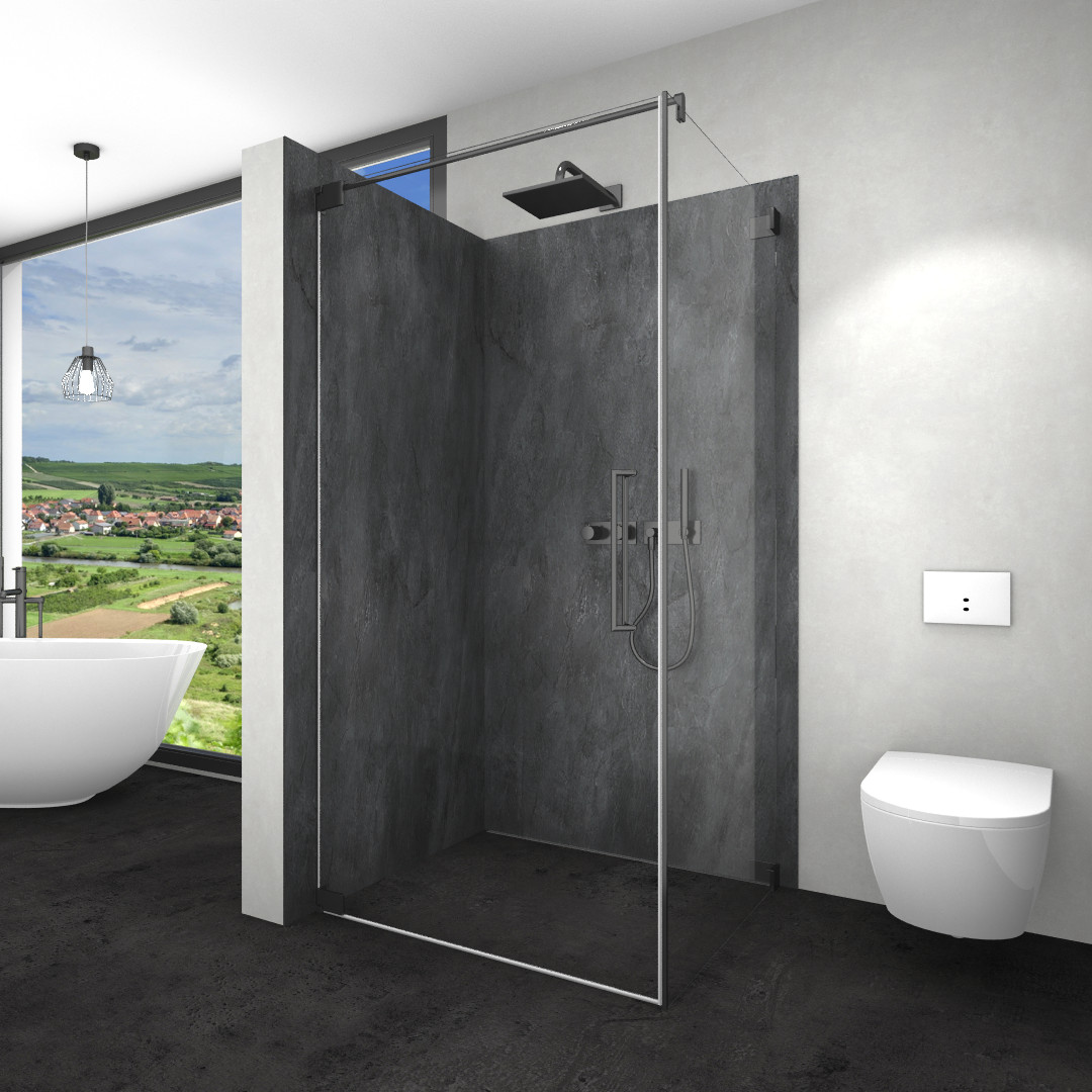Glas 8 mm ESG, Standardhöhe 200 cm, Tür öffnet nach Innen und Außen, bodeneben, ohne Schwallschiene, PALM.fix, PALM.lift, PALM.free, PALM.isi-clean, optional PALM.nano, PALM.care, punktuelle Wandbefestigung mittels Beschlägen