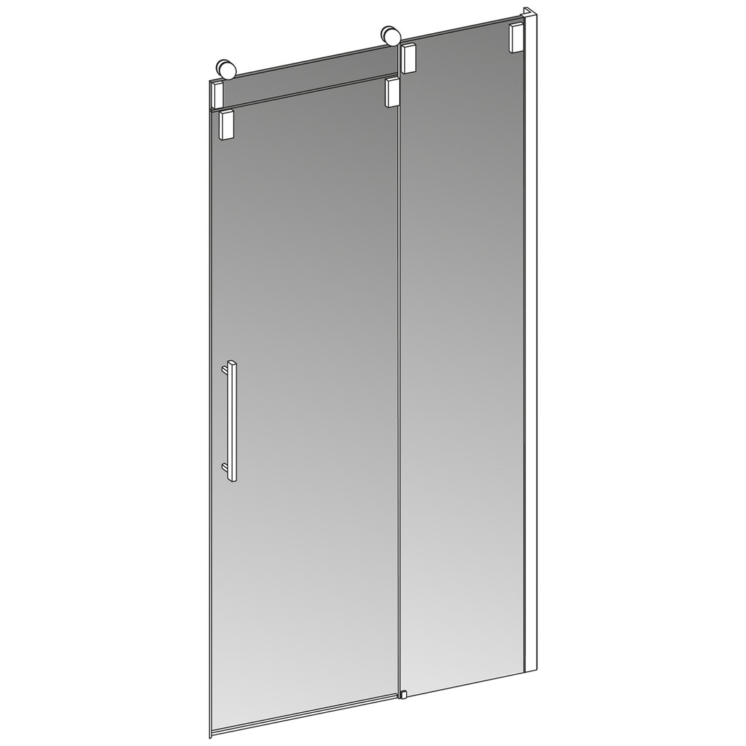 Glas 8 mm ESG transparent, Glaszarge 13 mm VSG, Standardhöhe Oberkante Glaszarge 2120 mm (Glaszarge 120 mm) plus 55 mm für Laufrollen, ein Teil fix, ein Teil schiebbar, optional mit 8 mm hoher Schwallschiene, PALM.free, PALM.fix, PALM.pro, PALM.motion, PALM.isi-clean, optional PALM.nano, PALM.care, durchgehendes Wandbefestigungsprofil mit Verstellbereich