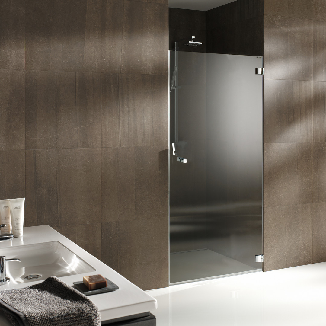 Glas 6 mm ESG transparent, Standardhöhe 2000 mm, Drehtüren öffnen nach außen, mit innen flächenbündigen Beschlägen, PALM.free, PALM. fix, PALM.lift, PALM.isi-clean, optional PALM.nano, PALM.care, punktuelle Wandbefestigung mittels Beschläge