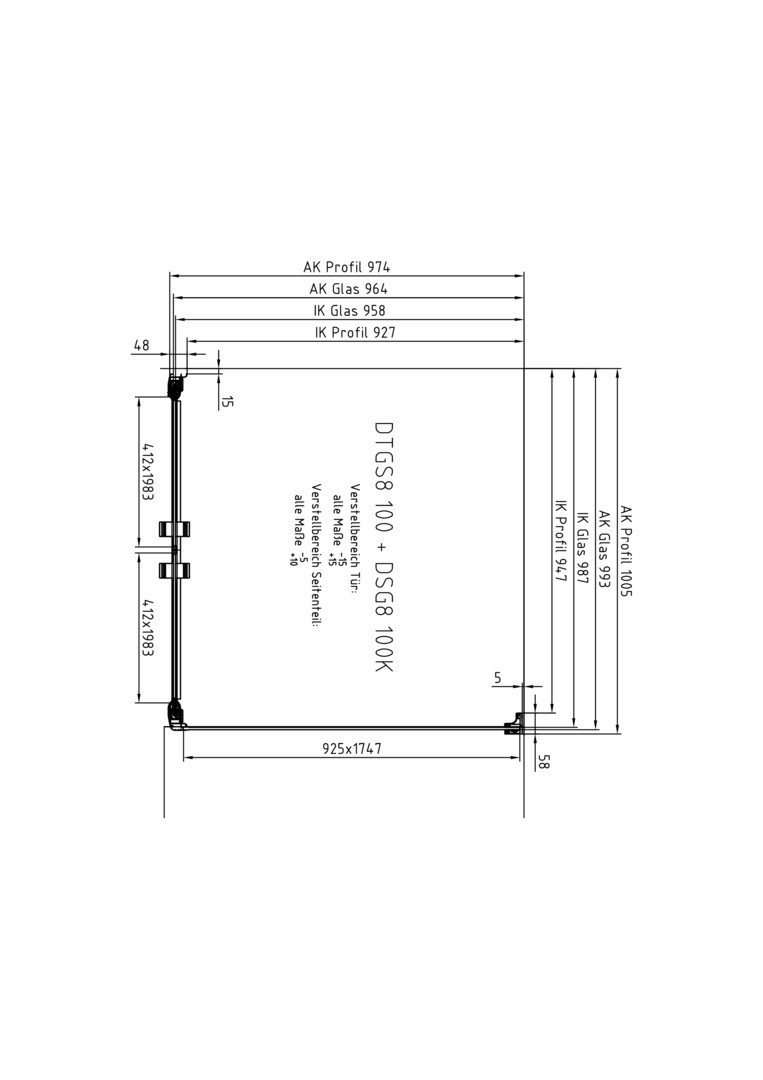 | Einbaubreite Tür für die Montage mit Seitenwand | 985 - 1015 mm |