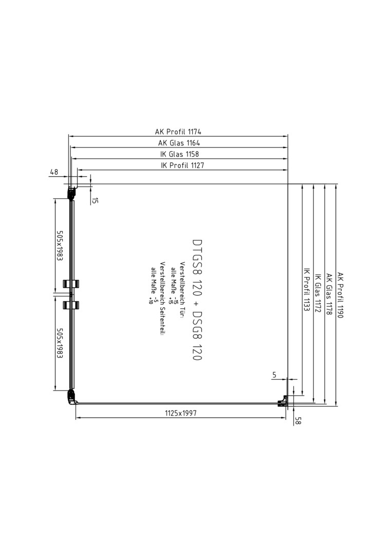 | Einbaubreite Tür für die Montage mit Seitenwand | 1185 - 1215 mm |