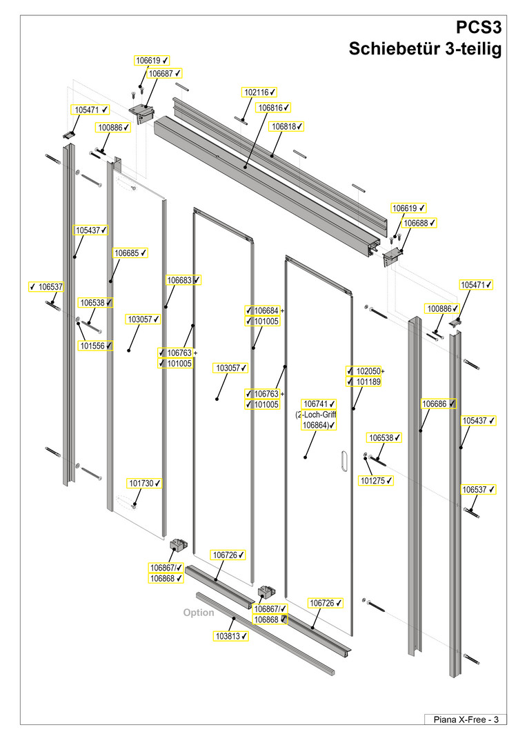 | Art der Tür | Schiebetür dreiteilig mit einem Festfeld |