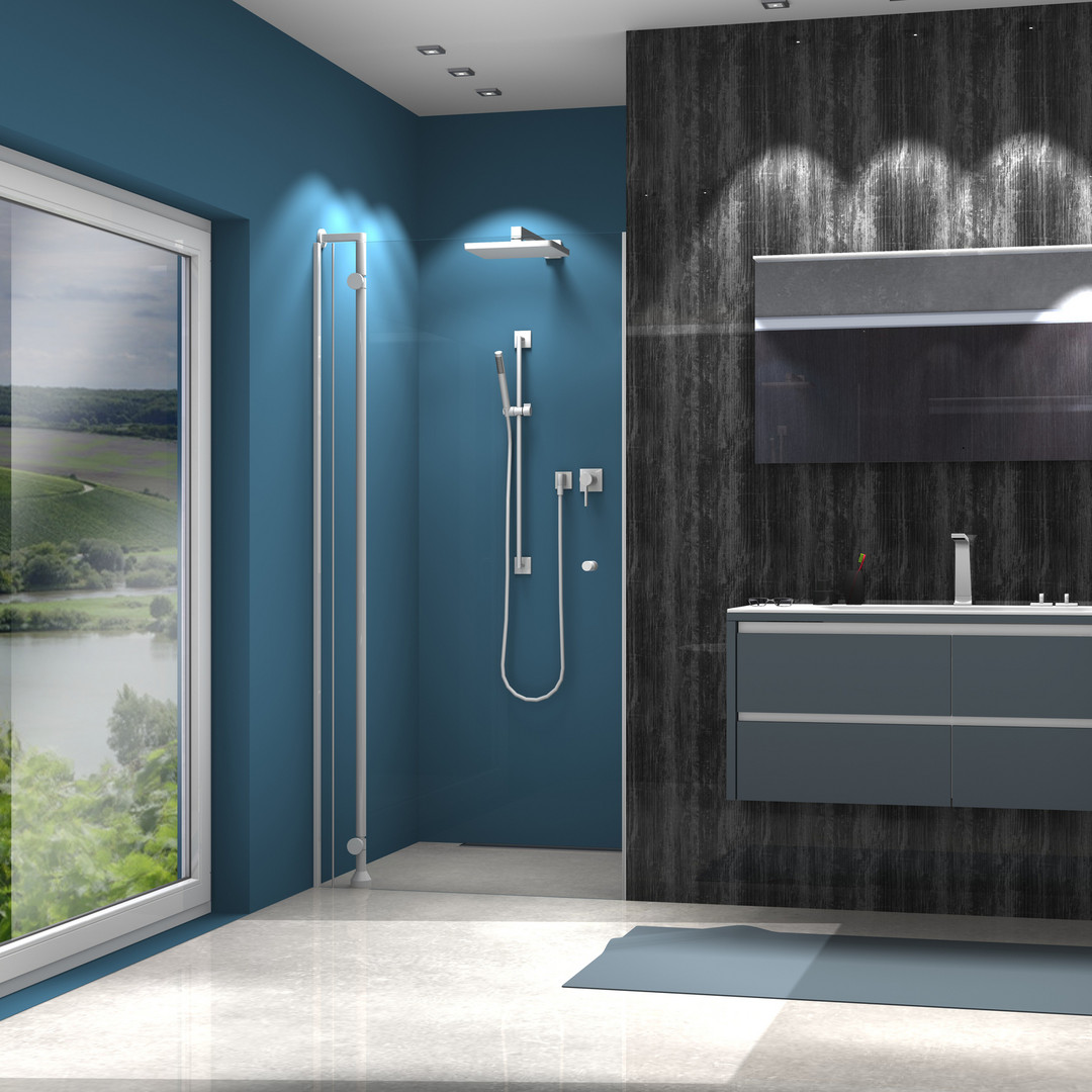 Befestigung innen, Glas 8 mm ESG transparent, Standardhöhe 2000 mm bzw. plus 55 mm Verstrebung, Tür öffnet nach innen und außen, mit flächenbündigen Beschlägen, Kombination mit Tube Accessoires möglich, Montage auf Fliesenboden oder auf Tube Duschwanne, PALM.free, PALM.fix, PALM.lift, PALM.pro, PALM.invisible, PALM.isi-clean, optional PALM.nano, PALM.care, PALM.magic