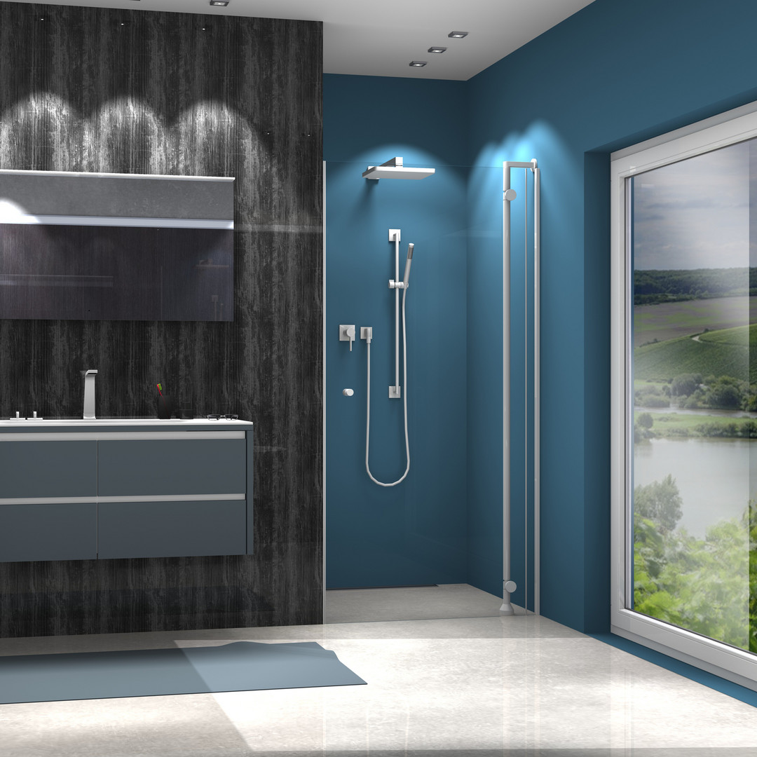 Befestigung innen, Glas 8 mm ESG transparent, Standardhöhe 2000 mm bzw. plus 55 mm Verstrebung, Tür öffnet nach innen und außen, mit flächenbündigen Beschlägen, Kombination mit Tube Accessoires möglich, Montage auf Fliesenboden oder auf Tube Duschwanne, PALM.free, PALM.fix, PALM.lift, PALM.pro, PALM.invisible, PALM.isi-clean, optional PALM.nano, PALM.care, PALM.magic