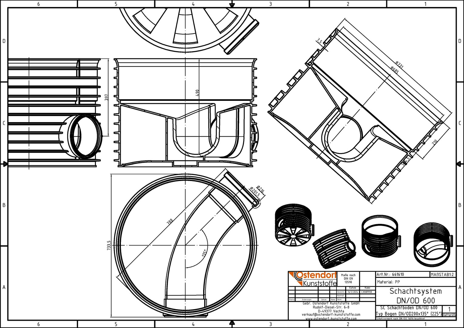 Ostendorf Schachtboden DN/OD 200, 135° (225°), Bogen, DN 600, PP