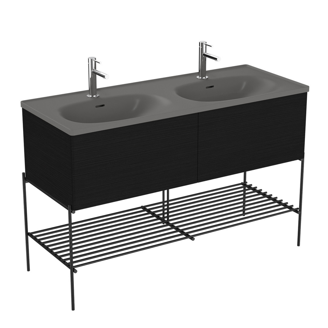 Höhe 86 cm, bodenstehend, wandgebunden, Korpus MDF und Thermofolie, Fussgestell mit Ablagegitter Metall schwarz matt pulverbeschichtet, 2 Vollauszüge (Softclose), mit Doppelmöbelwaschtisch steingrau matt, mit VitrA Clean, je 1 Hahnloch mittig Becken, mit je 1 Überlaufschlitz