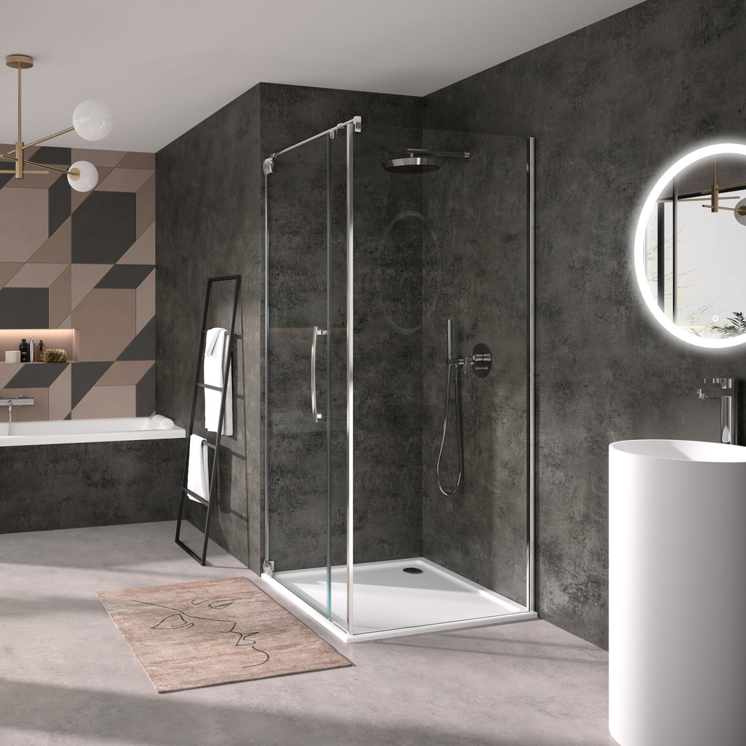Glas 8 mm ESG, Standardhöhe 200 cm bzw. plus 3 cm Verstrebung, Tür öffnet nach Innen und Außen, alternativ mit 4 mm oder 15 mm hoher Schwallschiene, PALM.free, PALM.fix, PALM.lift, PALM.pro, PALM.isi-clean, optional: PALM.nano, Palm.care, PALM.magic, schmales Wandprofil zur Montage auf oder in Fliese, kostenlose Naturmaßabnahme erforderlich