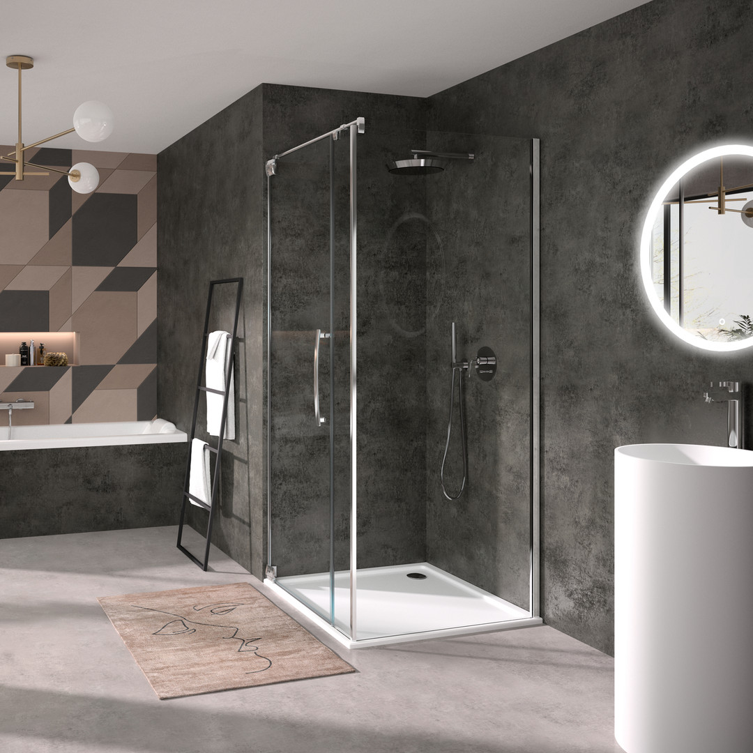 Glas 8 mm ESG, Standardhöhe 200 cm bzw. plus 3 cm Verstrebung, Tür öffnet nach Innen und Außen, alternativ mit 4 mm oder 15 mm hoher Schwallschiene, PALM.free, PALM.fix, PALM.lift, PALM.pro, PALM.isi-clean, optional: PALM.nano, Palm.care, PALM.magic, durchgehendes Wandbefestigungsprofil, kostenlose Naturmaßabnahme erforderlich