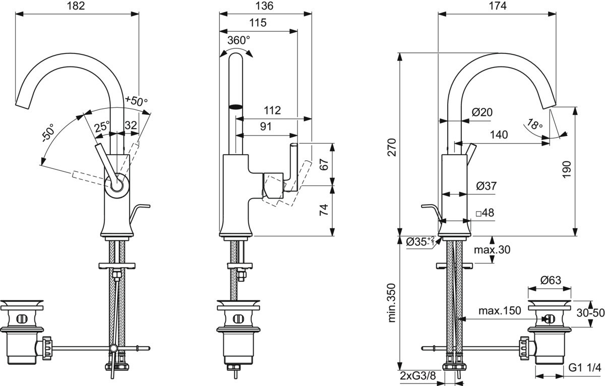 DN 15, Auslaufhöhe 190 mm, Luftsprudler, Caché (innenliegend), Metall-Zugstangen-Ablaufgarnitur G 1 1/4, flexible Anschlussschläuche G 3/8, Griff aus Metall, Schnellmontagesystem, Kartusche Ø 28 mm, CLICK-Kartusche mit keramischen Dichtscheiben, Kartuschenschwenkbereich 100°, Kartuschenübersetzung aus Kunststoff, Heißwassertemperaturbegrenzer, Schwenkbereich Auslauf 360°, Norm DIN EN 248, Geräuschverhalten DIN 4109 Gruppe 1, Lebensdauer DIN EN 817