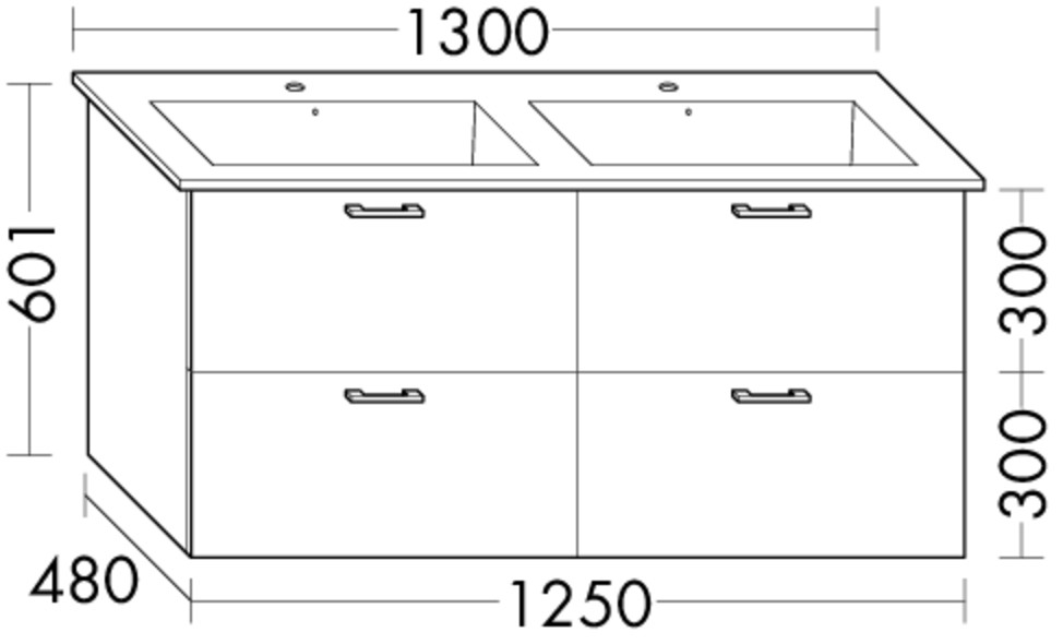 Schubladen oben, mit Siphonausschnitt, Tiefe 350 mm, Auszüge unten, Tiefe 420 mm