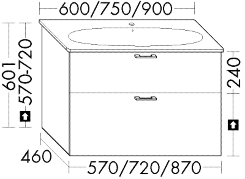 Schubladen oben, mit Siphonausschnitt, Tiefe 300 mm, Auszüge unten, Tiefe 350 mm