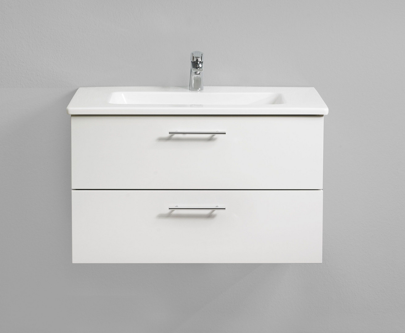 Waschtisch: Muldentiefe 120 mm, Beckenmaß 690 x 290 mm, Waschtischunterschrank, Schublade oben mit Siphonausschnitt, Auszug unten, mit Raumsparsiphon