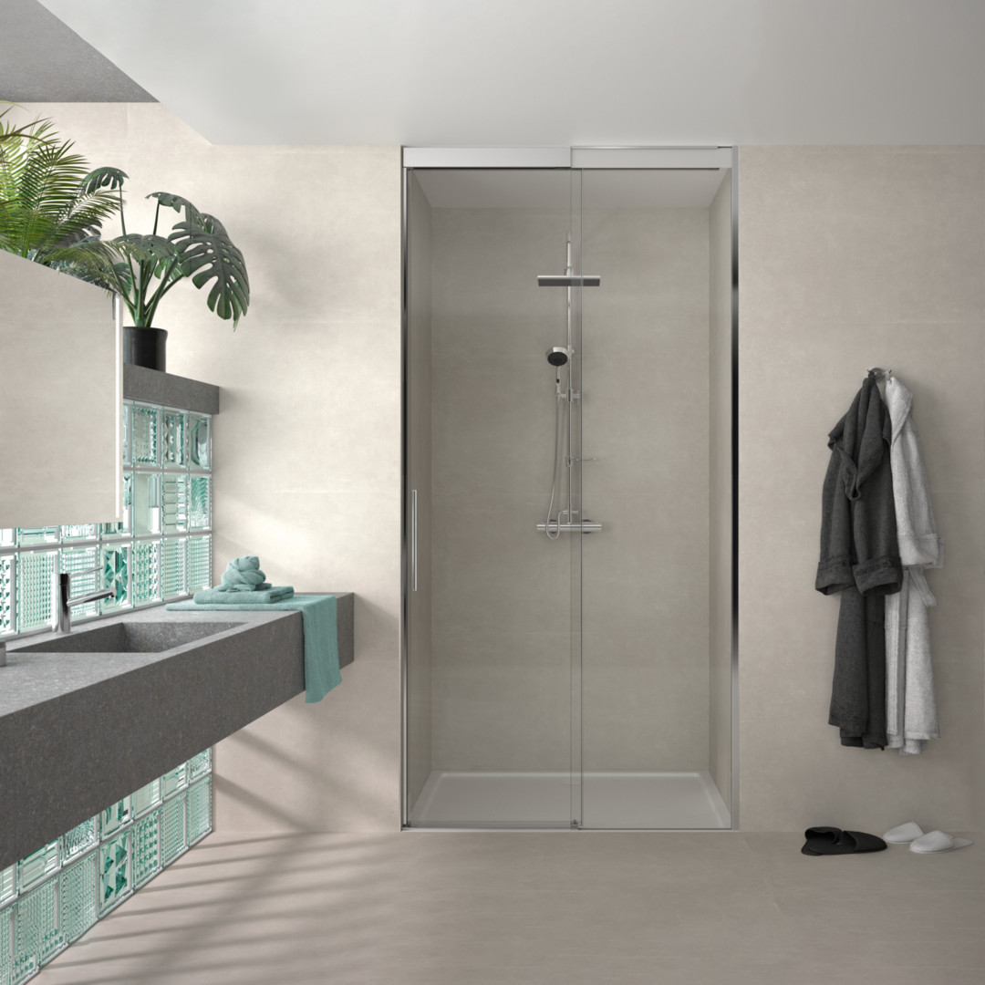 Glas 8 mm ESG transparent, Standardhöhe 2100 mm, ein Teil fix, ein Teil zum Schieben, Druckgussteile (kein Kunststoff), barrierefrei, optional mit 8 mm hoher Schwallschiene, PALM.free, PALM.fix, PALM.pro, PALM.motion, PALM.soft, PALM.isi-clean, optional PALM.nano PALM.care, durchgehendes Wandbefestigungsprofil mit Verstellbereich
