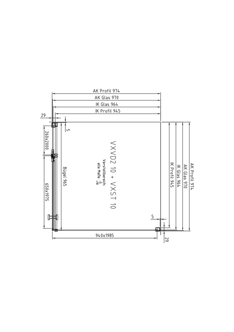 | Einbaubreite Tür für die Montage mit Seitenwand | 985 - 1000 mm |