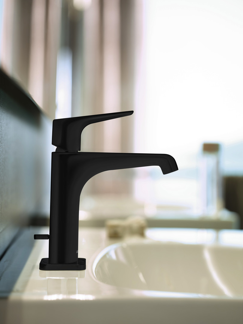 hansgrohe Waschtisch-Einhebelmischer 130 Axor Citterio E Ausladung 143mm, mit Hebelgriff Zugstangen-Ablaufgarnitur, mattschwarz