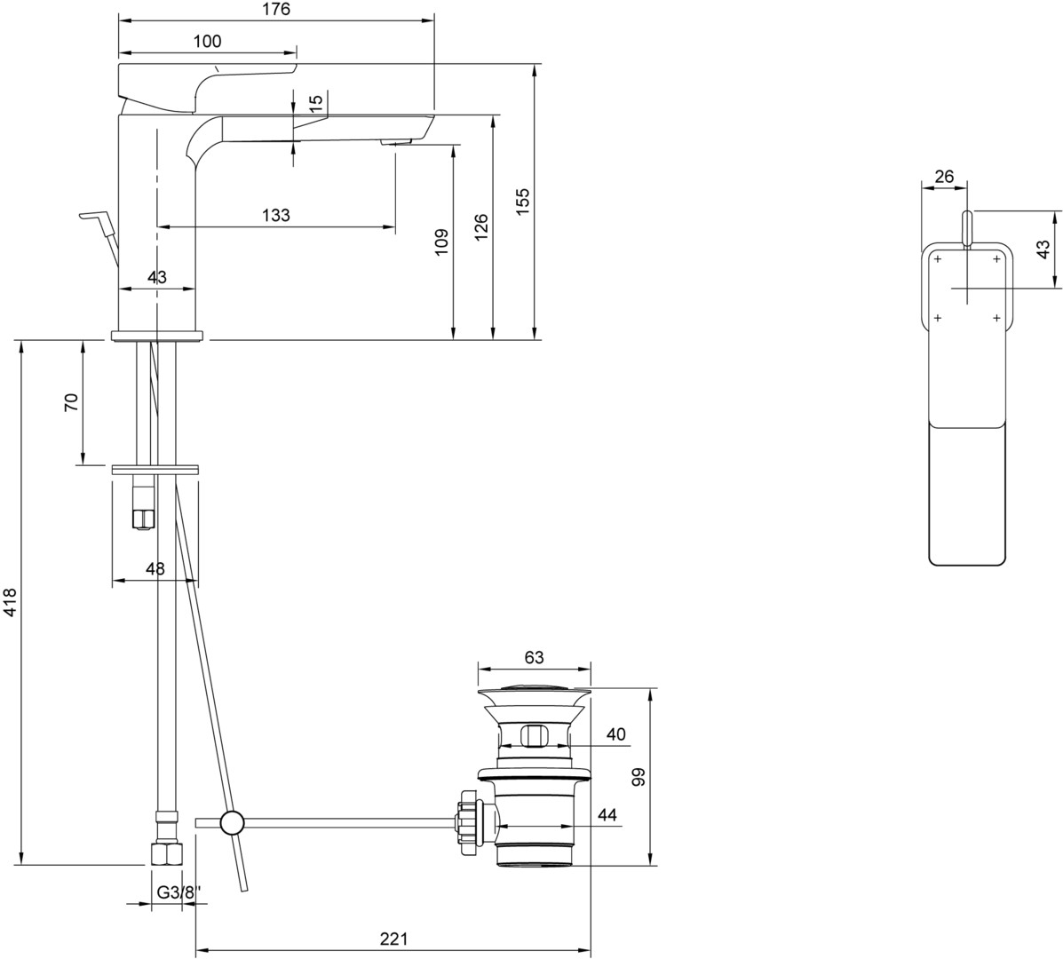 51 x 155 x 176 mm, Eckig, Kippen, Material aus Messing, Keramikkartusche, Standmontage, Anschlusstyp 3/8'', mit verstellbarem Strahlregler, maximale Durchflussmenge bei 3 bar 4,0 l/min, Auslauflänge 134 mm, Auslaufhöhe 110 mm