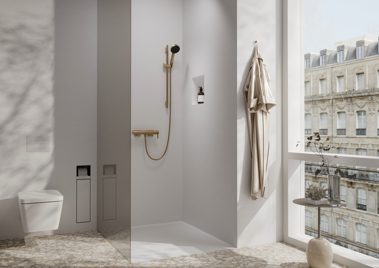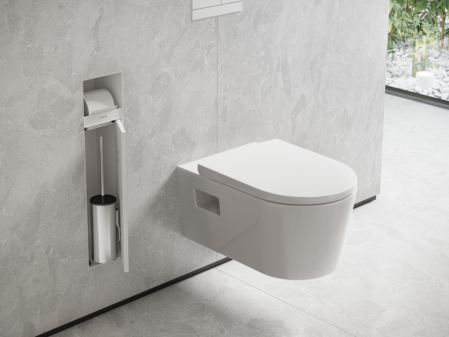 bestehend aus: Wandnische mit befliesbarer Tür, Toilettenbürstenhalter, Papierrollenhalter, Installationsset, Dichtungsset, Push-Open-Tür 12 mm tief, Einbautiefe 140 mm, Anwendungsbereich Neubau, Sanierung, Anpassung an Fliesenstärke möglich, rahmenloses Design, Wandtyp Trockenbau, Nassbau, Dichtungsset Polystyrol (PS), Werkstoffgüte Wandnische Edelstahl V2A (1.4301), Bürstenhalter Kunststoff, verchromt, Wandnische 595 x 145 x 140 mm, Dichtungsset 606 x 176 x 140 mm, Vermeidung von Wasserschäden durch wasserdichtes Grundset und vormontiertes Dicht-Vlies