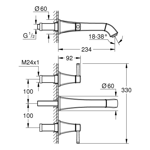 GROHE Fertigmontageset Grandera 1/2", Waschtisch-3-Loch-Wandarmatur, Ausladung 23,4cm, chrom/gold W294353