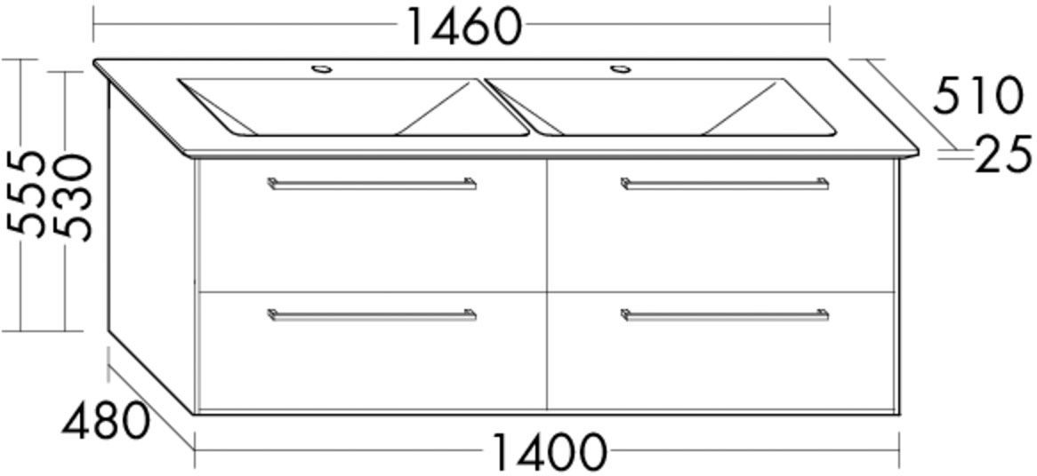 Mineralguss-Doppelwaschtisch: Muldentiefe: 120 mm, Beckenmaß 585 x 320 mm, Waschtischunterschrank: 2 Schubladen oben mit Siphonausschnitt und 2 Auszüge unten mit Raumsparsiphon