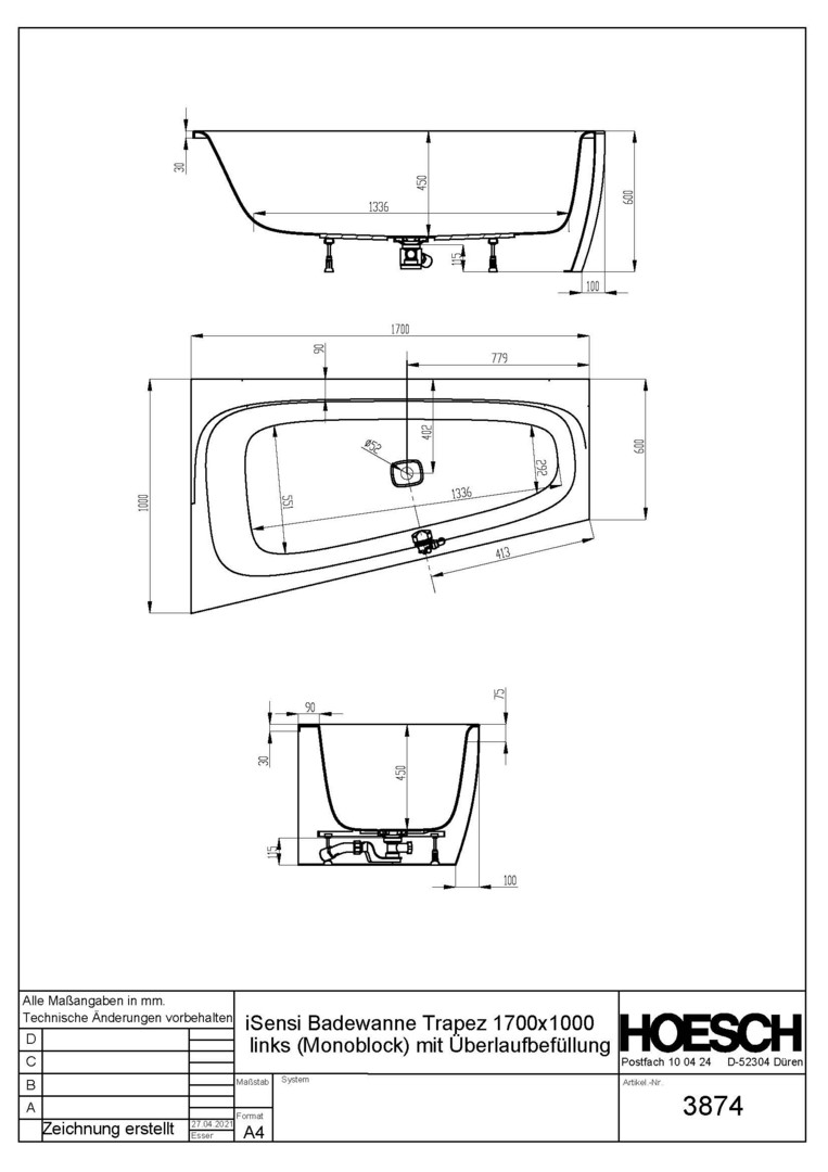 Hoesch Badewanne iSENSI Trapez 170x100cm, links, Überlaufschlitz und Klick/Klack, weiß W210550