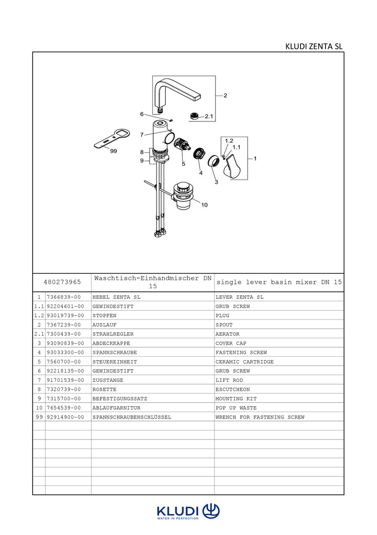 KLUDI ZENTA SL Waschtisch-Einhebelmischer Hebel seitlich, mit Ablaufgarnitur, schwenkbarer Auslauf 360Grad, chrom W324831