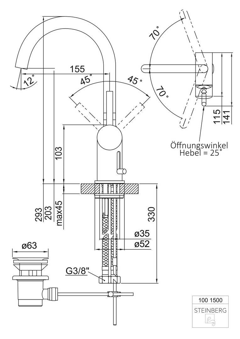 Steinberg Waschtisch-Einhebelmischer Serie 100 schwenkbarer Auslauf, mit Ablaufgarnitur 1 1/4", chrome W323539