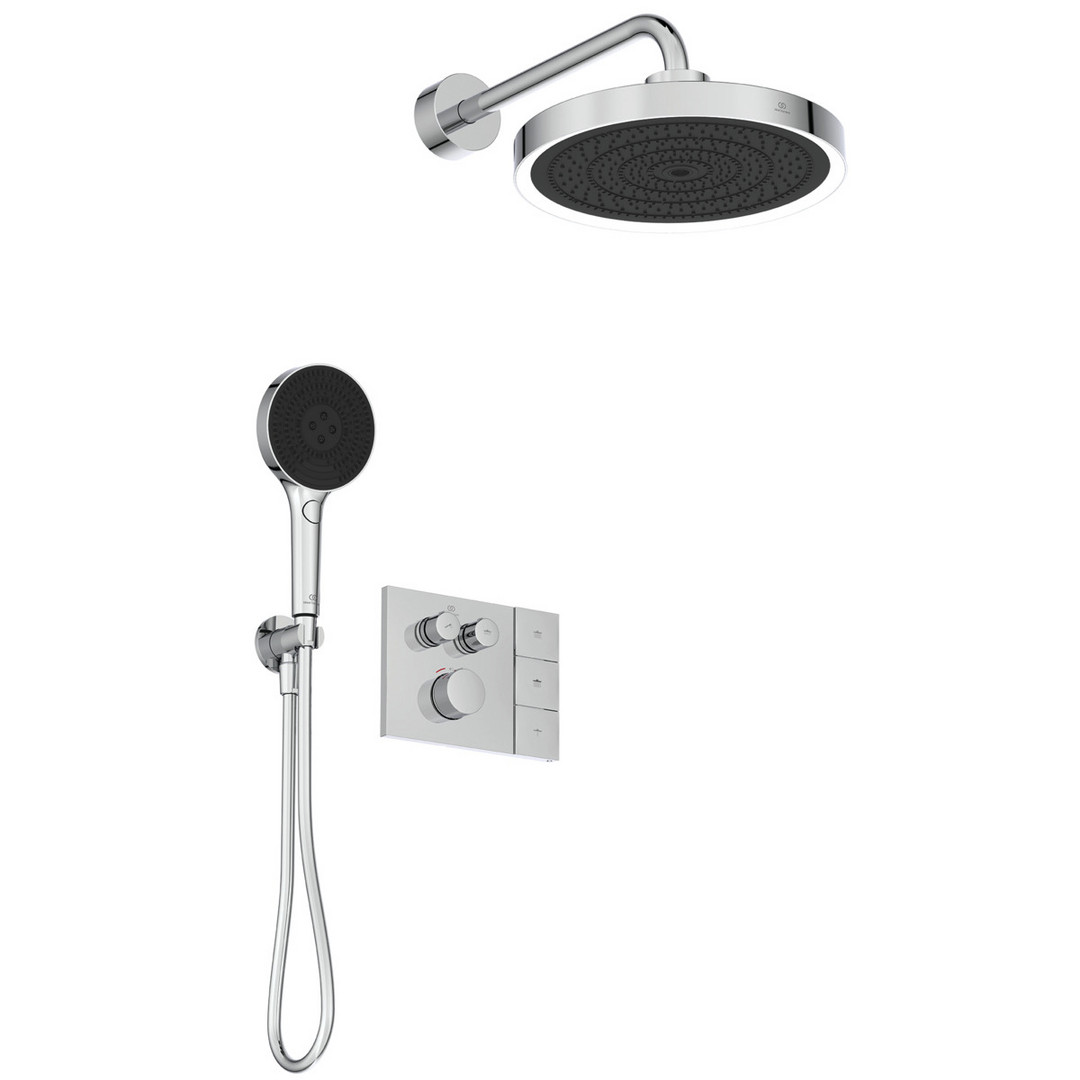 bestehend aus A7894.. - Brausethermostat Unterputz Bausatz 2 für Fertigmontage, mit optional montierbarem Rahmen für Solos Regenbrause-Fernbedienung, zwei Entnahmestellen, Rückflussverhinderer, Unterputz-Bausatz 1 zur Montage benötigt (A1000NU - separat erhältlich), Griff aus Metall, Rosette 213x157 mm, Thermostatkartusche mit Wachsdehnstoffelement, Heißwassertemperaturbegrenzer, Temperatursperre 40 °C, Heißwassertemperatureinstellung mit Verbrühschutz, DICHT-FIX System separate Abdichtung jeder Öffnung für optimalen Schutz des Bauwerks gegen Feuchtigkeit und Wasser, Geräuschverhalten DIN4109 Gruppe 1, Lebensdauer DIN EN 200, DIN EN 1111, A1000.. - Unterputz-Bausatz 1 für Unterputz-Einhebelmischer und Thermostate (mit Navigo) Bausatz 2, Wandeinbau, Vormontage im Rohbau, mit Putzschablone und Spülblock, Anschlüsse G 1/2, DZR entzinkungsbeständig, Einbautiefe 73-95 mm, Höhenversteller 5-40 mm, Geräuschverhalten DIN 4109 Gruppe 1, Gewicht 0,986 kg, A7890.. - Regenbrause, 3-Funktion, Strahlarten Regen, sanfter Regen und Massage, Ø 330 mm, Kugelgelenk, EasyClean, Anschluss G 1/2, mit Wandanschluss, mit LED-Leuchtring, weiß, sensorgesteuert, Farbwechsel möglich nur per Zigbee, Netzbetrieb (230 V), Strahlartenumstellung per Fernbedienung (im Lieferumfang enthalten), Batteriebetrieb (6 V), Gewicht 3,970 kg, A7896.. - Solos Handbrause, 3-Funktion, Strahlarten Regen, Massage und sanfter Regen, Ø 130 mm, Navigo Druckknopfumschaltung, EasyClean, Anschluss G 1/2, Gewicht 0,700 kg, BC807.. - Wandanschlussbogen Unterputz, mit Brausehalter, Rückflussverhinderer, DVGW-eigensicher, Brauseschlauchanschluss G 1/2, Wandanschluss G 1/2, Gewicht 0,187 kg, BE175.. - Brauseschlauch, Idealflex, Anschluss G 1/2