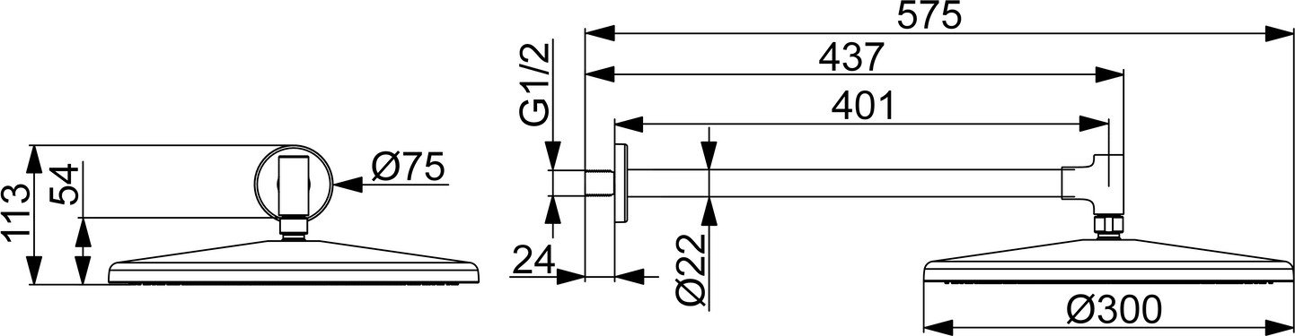 Heißwasserversorgung max. 65°C, Arbeitsdruck 0,5-5 bar, Durchfluss bei 3 bar (mit Begrenzer) 12 l/min, Anschlussgröße G1/2, Kopfbrausengröße Ø 300 mm, Sicherungseinrichtung (EN1717) EB, Geräuschklasse I (ISO 3822), Material Messing/Verbundwerkstoff, Kopfbrause, schwenkbares Kugelgelenk, Anti-Kalk-Technik Außengewinde, Abdeckung(en), 1-strahlig