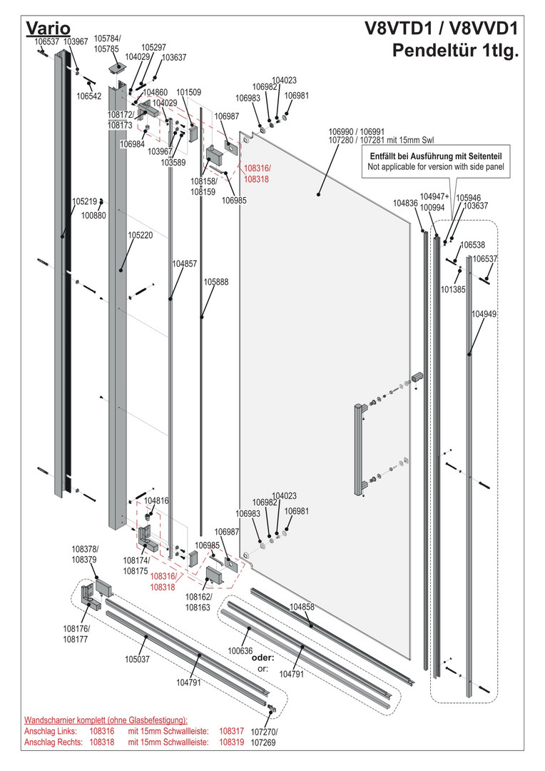 1-teilig, Glas 8 mm ESG transparent, Standardhöhe 2000 mm, Tür öffnet nach innen und außen, mit innen flächenbündigen Beschlägen, bodeneben, optional mit Schwallschiene 4 oder 15 mm hoch, PALM.free, PALM.fix, PALM.lift, PALM.isi-clean, optional PALM.nano, PALM.care, PALM.magic, durchgehendes Wandbefestigungsprofil mit Verstellbereich