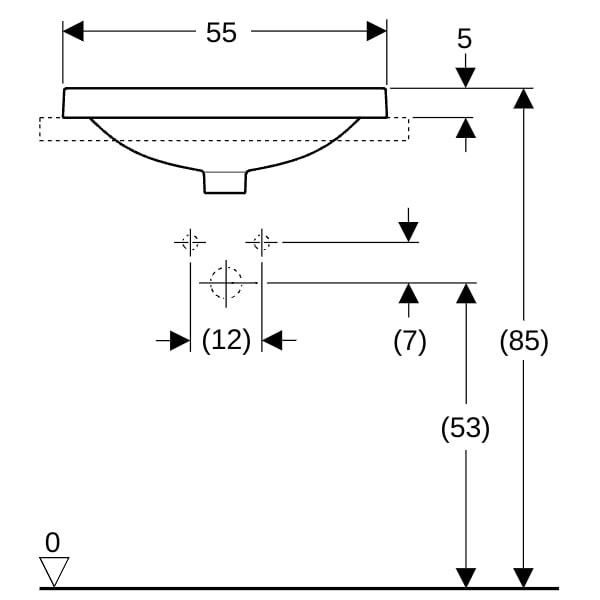 Geberit Einbau-Waschtisch VariForm 55x40cm, ohne Hahnloch, mit Überlauf, rechteckig, Unterseite glasiert / weiß