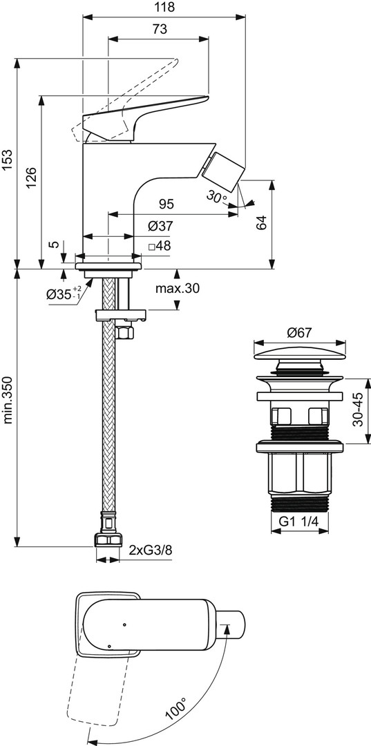 Auslaufhöhe 64 mm, Luftsprudler (sichtbar), Strahlregler mit Kugelgelenk, Kunststoff-Push-Open Ventil, flexible Anschlussschläuche G 3/8, Griff aus Metall mit Rot-/Blau-Markierung, Schnellmontagesystem Easy-Fix, BlueStart, Kartusche: Ø 28 mm, FirmaFlow Kartusche mit keramischen Dichtscheiben, Kartuschenschwenkbereich 100°, Heißwassertemperaturbegrenzer, Norm DIN EN 248, Geräuschverhalten DIN 4109 Gruppe 1, Lebensdauer DIN EN 817, Gewicht 0,911 kg