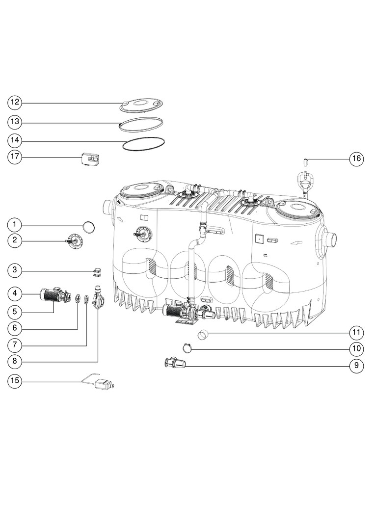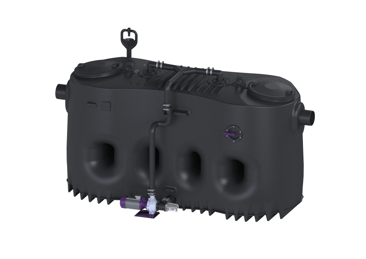 aus PE, Einbau in frostgeschützten Räumen, mit Direktentsorgung, Schredder-Mix-System, mit/ohne Schauglas, Fülleinrichtung, Pumpe, die Fließrichtung kann durch Austauschen des Zu- und Ablaufstutzens geändert werden, Pumpenleistung 3 kW, Kabellänge für Anbauteile 5 m, Anlage komplett montiert, Zubehör Probenahmeeinrichtung, Hebeanlagen, Schauglas