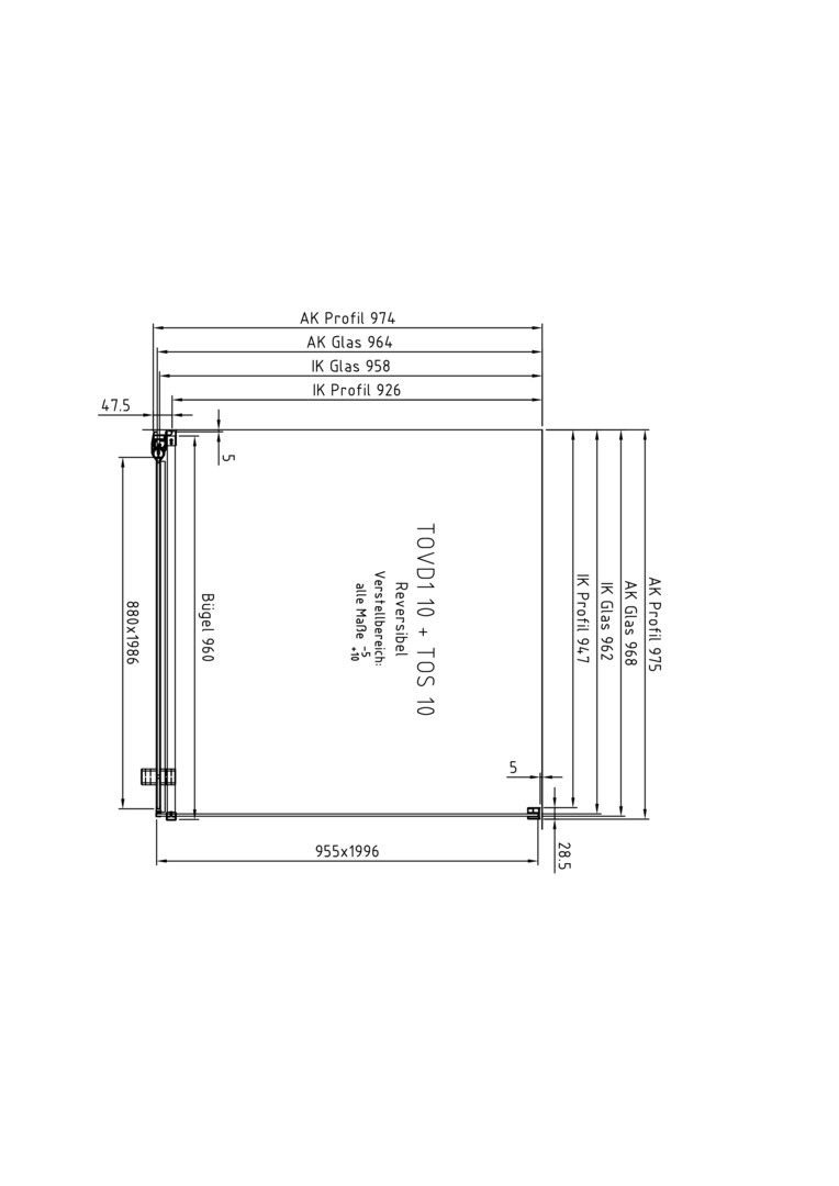 Palme Pendeltür zu Seitenteil Top Drive R 98,5 x 200 cm, ESG transparent, cenit-chrom, 1-teilig, reversibel