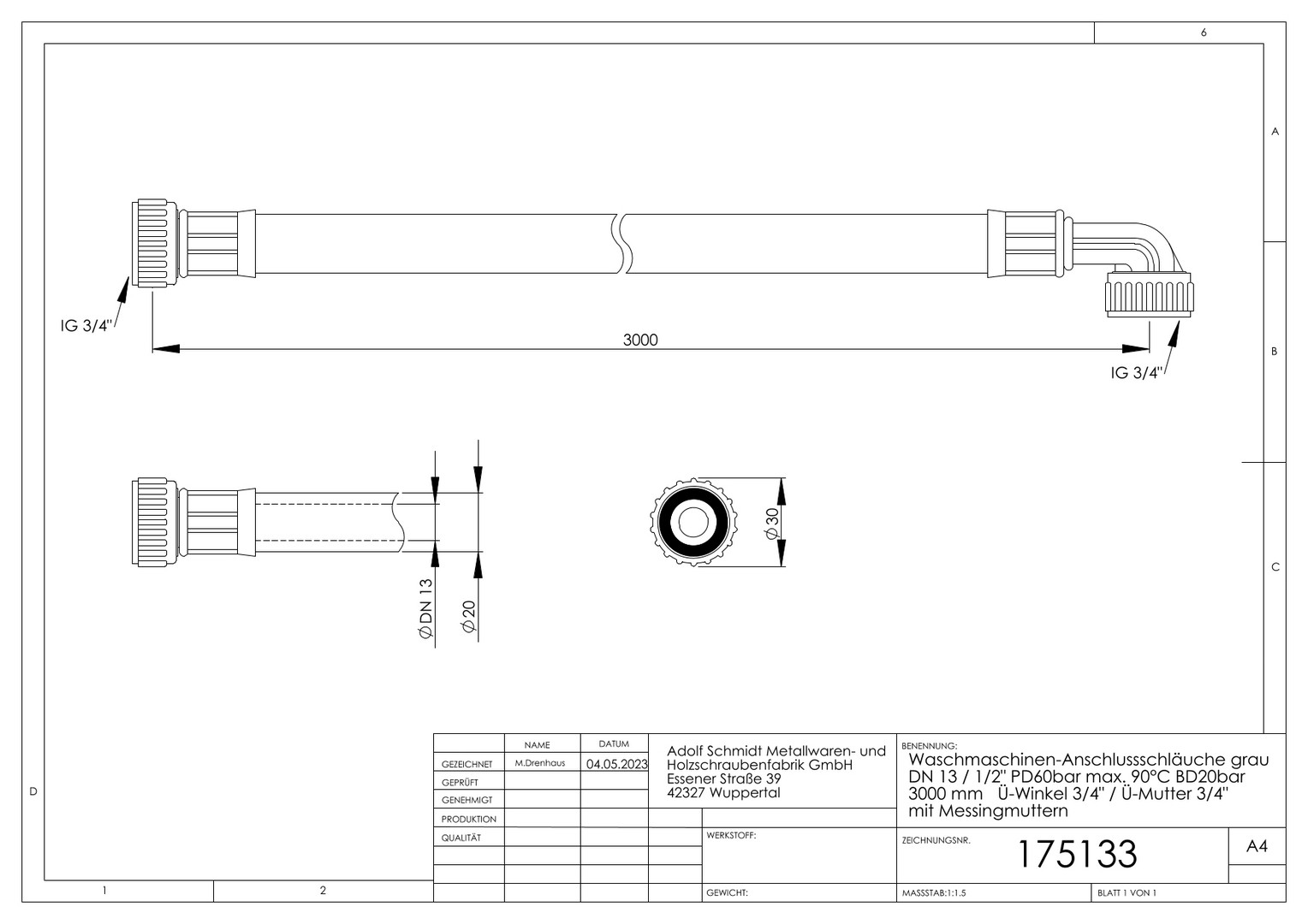 Betriebsdruck 20 bar, Platzdruck 60 bar, bis max. 90 °C, einerseits Überwurfwinkel Messing IG 3/4", andererseits Überwurfmutter Messing IG 3/4"