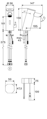 9 VDC, 100 - 240 VAC, 50 - 60 Hz, berührungslose, sensorgesteuerte Armatur mit innovativer ToF-Technologie, unempfindlich gegenüber reflektierenden Materialien wie z.B. Spiegeln, Warnwesten etc., mit integrierter Bluetooth-Schnittstelle, parametrierbar über SCHELL App, geeignet zur Vernetzung mit SCHELL Wassermanagement-System SWS, Einstellmöglichkeiten über SCHELL App, Parametrierung über voreingestellte Betriebsmodi (Strom sparen / Wasser sparen / Komfort), individuelle Einstellungen im Expertenmodus (Sensor-Reichweite, Sensor-Messintervall, Personenerkennung, max. Laufzeit, Nachlaufzeit), Stagnationsspülung (Aus / im Intervall / Bedarfsgerechtes Spülen unter Berücksichtigung der Nutzungen / zu festen Terminen )Tag(e), Uhrzeit), Dauerspülung für thermische Desinfektion, Auslösung per App (3 - 10 min), Dauerfluss, Auslösung per App (15 - 600 s), Reinigungsstopp, Auslösung per App oder Nahreflex (Aus / 60 – 360 s), Durchfluss max. 5 l/min druckunabhängig, Fließdruck 1,0 - 5,0 bar, max. Ruhedruck 8 bar, max. Betriebstemperatur 70 °C (80 °C für thermische Desinfektion), Werkstoff Gehäuse Messing, Oberfläche chrom, Anschluss G 3/8 IG, bestehend aus Time-of-Flight-Sensor-Einlocharmatur, Temperaturregler, Time-of-Flight-Sensor-Elektronik (ToF) mit automatischer Justierung des Sensorbereichs, Axialmagnetventil 6 V mit Vorfilter, versenkter Strahlregler (diebstahlgeschützt), Anschlusskabel 220 mm, mit Steckverbinder 3-polig, Schutzklasse IP 65, flexibler Anschlussschlauch Clean-Fix S G 3/8 IG x 410 mm, mit integriertem Rückflussverhinderer (RV, EN 1717: EB) und Vorfilter, Befestigungsmaterial für Waschtischmontage