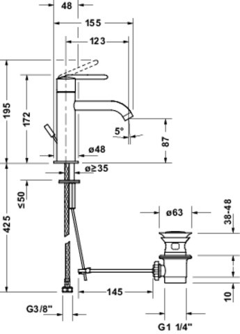 Standmontage, Höhe 172 mm, Keramikmischsystem, Strahlformer, flexible Anschlussschläche 3/8", Durchflussmenge 4 l/min bei 3 bar, Normalstrahl