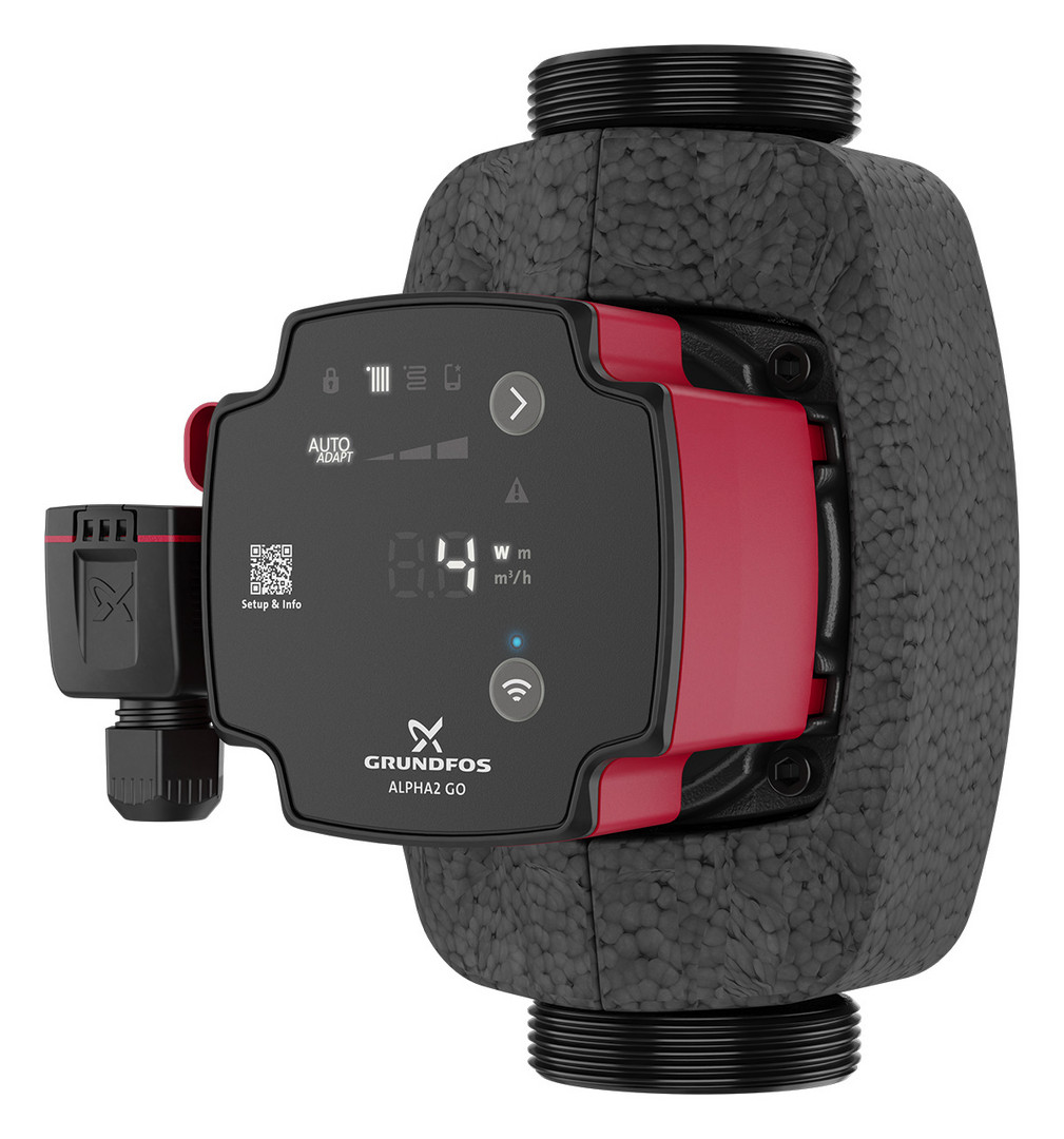 für Heizungs- und Klimaanlagen, über integrierte Bluetooth-Schnittstelle lässt sich eine Verbindung zur App Grundfos GO herstellen, Anschluss Zulauf G, Betriebsdruck max. 10 bar, Versorgungsspannung 1 x 230 V +- 10 %, 50/60 Hz, PE, Schutzart IPX4D, Pumpengehäuse Grauguss, mit Alpha-Kabelklemmstecker, Wärmedämmschale und Dichtungen (ohne Verschraubungssatz)