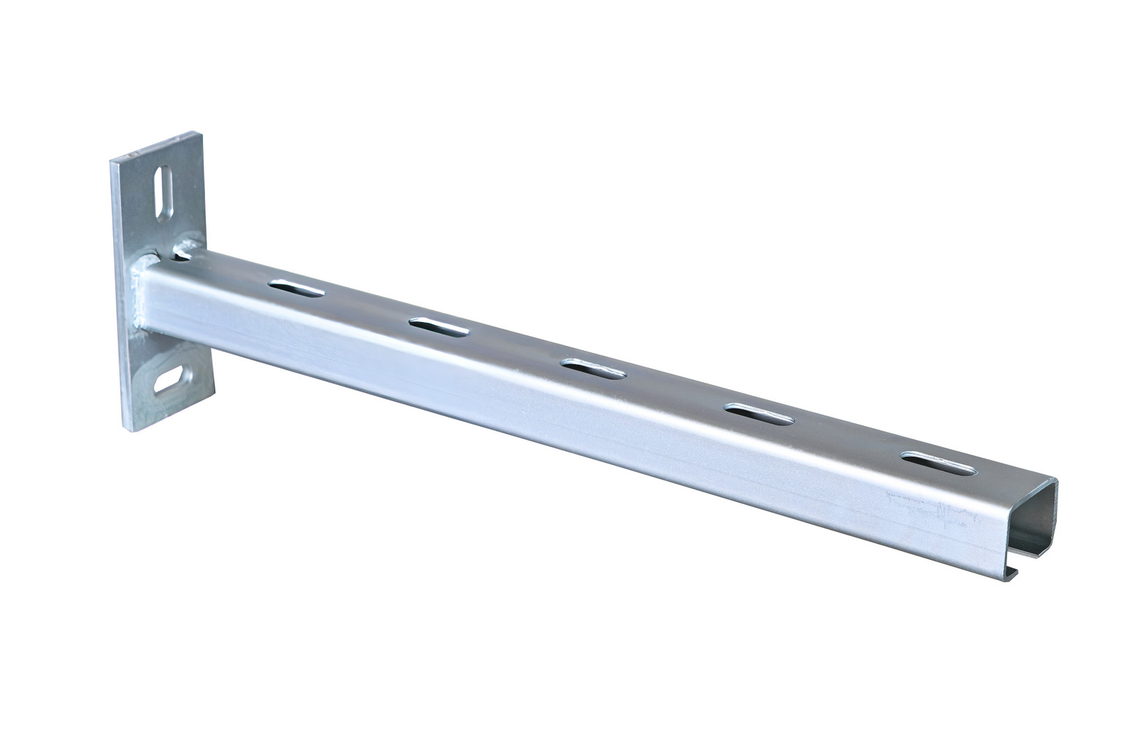 Wandplatte mit angeschweißter C-Profilschiene, auch geeignet zur Befestigung an Decken, Befestigungslöcher sind als Langlöcher um 90° zueinander ausgestanzt, um den Montagekomfort zu verbessern, Co2-geschweißt, Oberflächenbeschichtung Ultra Protect 1000 Systemtechnologie, ein System für Installationen im Innen-und Außenbereich, besteht min. 1000 Std. Salzsprühtest nach DIN ISO 9227