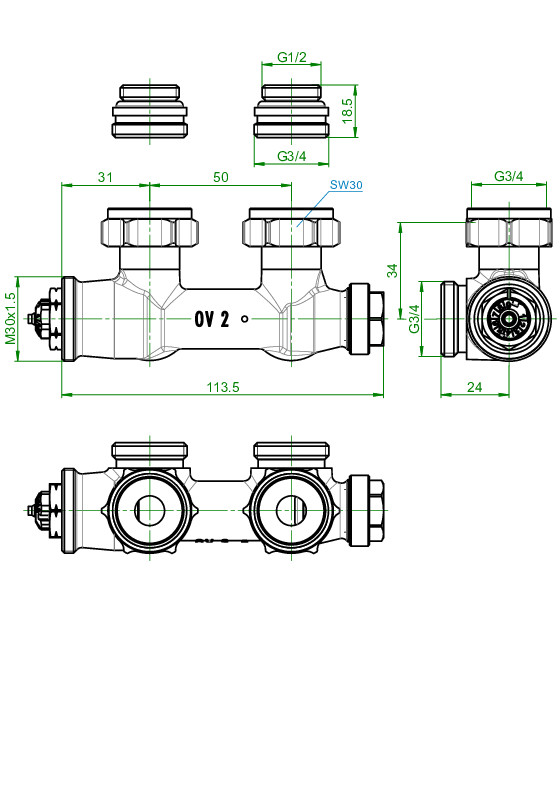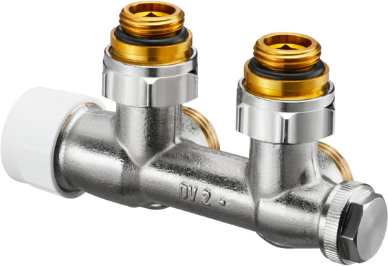 voreinstellbar, Thermostatanschluss links, mit Befüll- und Entleerung, Betriebstemperatur 2-120 °C, Messing vernickelt, Thermostatgewinde M 30 x 1,5, absperrbar, Medium Wasser/Wasser-Glykolgemisch, Rohrabstand 50 mm, max. Betriebsdruck 10 bar