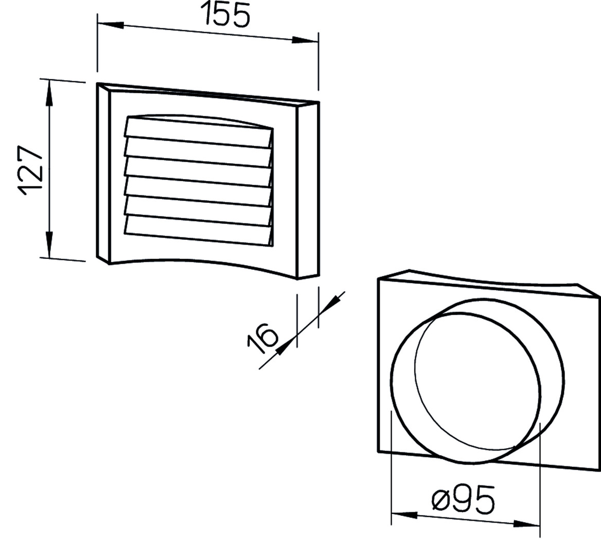mit schräggestellten Lamellen zur Abdeckung von runden Lüftungsöffnungen, Montage durch rückseitigen Einsteckstutzen mit Klemmfedern und Dichtband