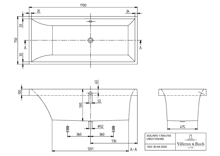 V&B Rechteck-Badewanne Squaro 170 x 75 cm, weiß, Ablauf mittig, Quaryl W214467
